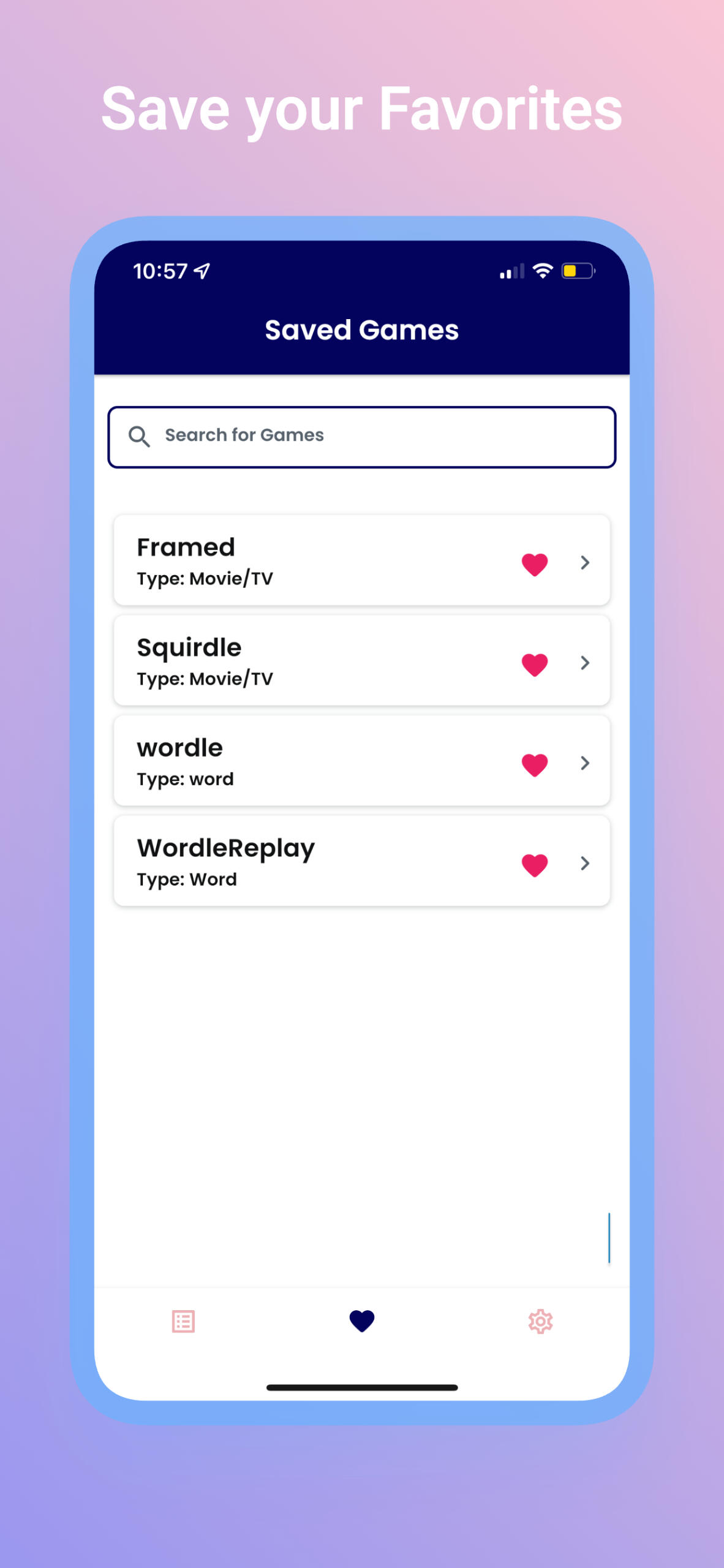 The app uses local storage (on your device) to save your favorite games for quick access. This data is stored only on your device and is never transmitted to us or third parties.Usage Data